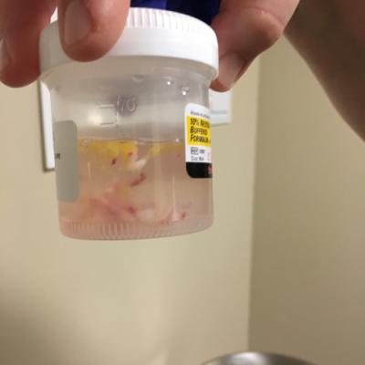 The attached photo (photo credit Meaghan, selfie style) displays what they literally vacuumed out of her this morning. Did anyone else know that’s what is floating in your tissue? Crazy.