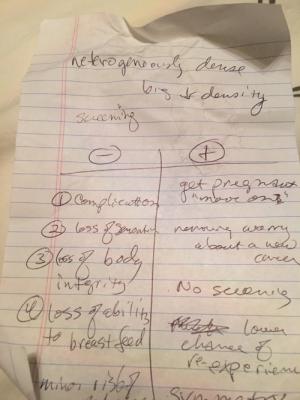 We sat there, in the cramped dimly-lit room–me topless, Mike fidgeting from being away from work before tax season and likely rolling through some PTSD triggers–and made a pros-cons list of the mastectomy (that’s the pic attached to the blog post).