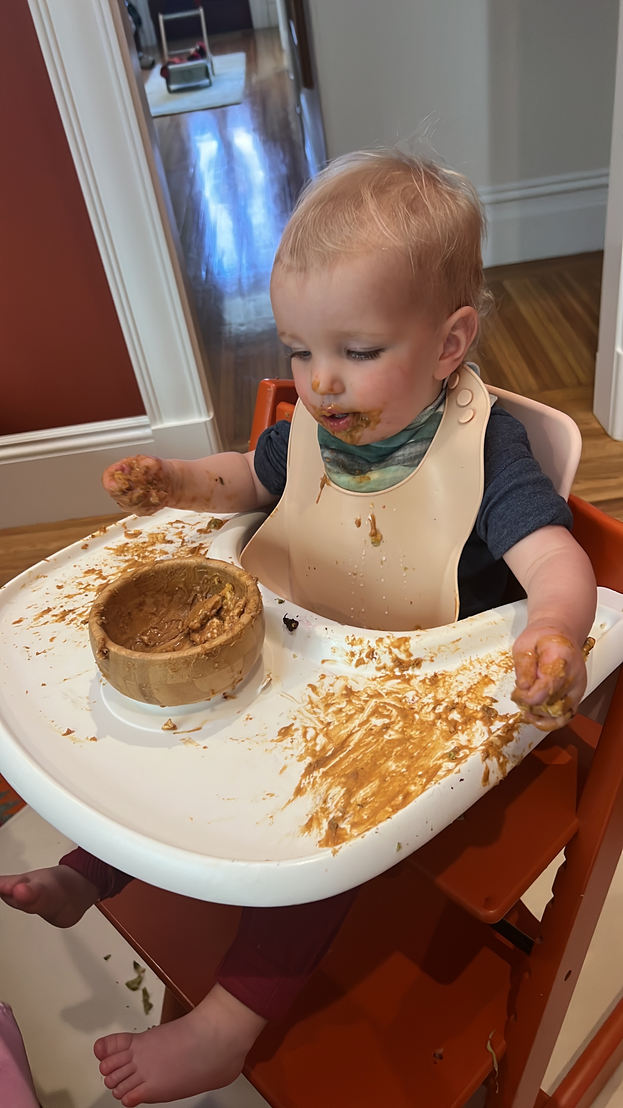 “Mmmmmmmmmmm nom nom” is the sound she makes, intonating up and down, crescendoing as she exhales. She perches in her orange high chair at mealtime. Her hands are stretched towards the ceiling, twisting at the wrist in circles and her legs are outstretched, feet twirling at the ankles. An orchestrated dance. And she chews and masticates and delights in whatever she managed to get into her mouth. Maybe it was coconut yogurt and pineapple. Tonight, enchiladas. It doesn’t matter.